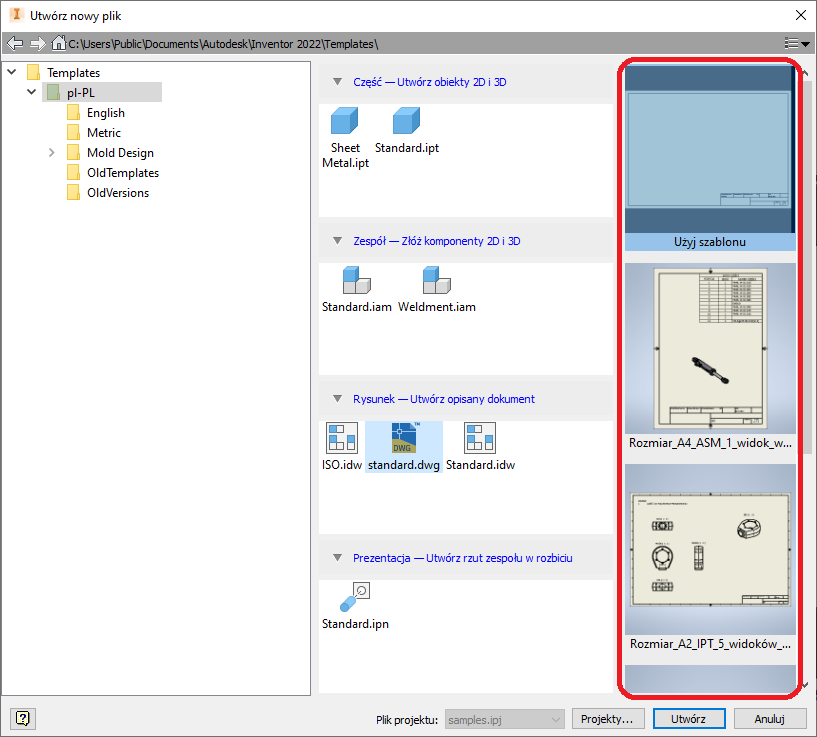 Ostatnią funkcjonalnością, którą możemy wykorzystać do przyśpieszenia tworzenia dokumentacji są formaty arkuszy. Już od kilku wersji Autodesk Inventor w przeglądarce znajduje się folder „Formaty arkuszy”. Dzięki nim mogliśmy klikając PPM i wybierając z menu podręcznego „Nowy arkusz” wskazać plik modelu i program zgodnie z danym formatem tworzył odpowiednie rzuty. Od wersji 2021 w oknie tworzenia nowego rysunku zauważamy podgląd wszystkich formatów w danym szablonie i możemy od razu tworzyć dokumentację w wybranym formacie. Nie ma konieczności tworzenia najpierw pustej dokumentacji.