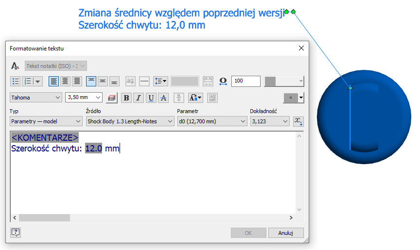 Umieszczając uwagi ogólne lub tekst na linii odniesienia w oknie formatowania tekstu warto zauważyć, że mamy możliwość umieszczania w notatce zarówno właściwości iProperty jak również parametrów modelu. Dzięki temu możemy w trakcie modelowania zwracać uwagę na szczególne parametry elementu.