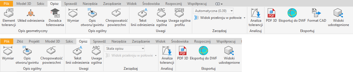 W środowisku Autodesk Inventor na wstążce zarówno w środowisku części jak i zespołu opisom poświęcona została cała jedna zakładka – Opis. Znajdziemy na niej wiele poleceń służących do tworzenia zarówno prostych słownych opisów jaki i specjalistycznych, znormalizowanych oznaczeń.