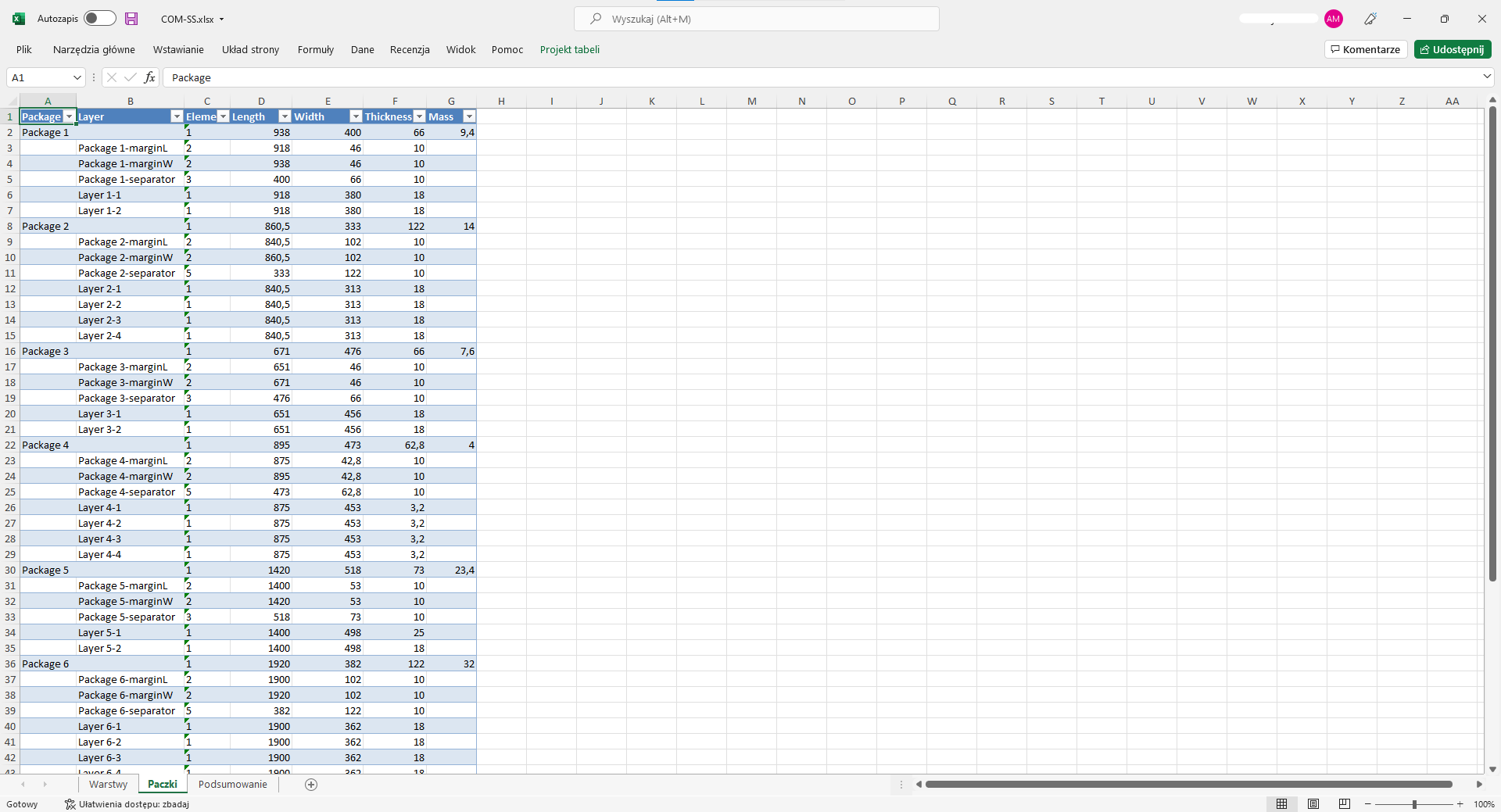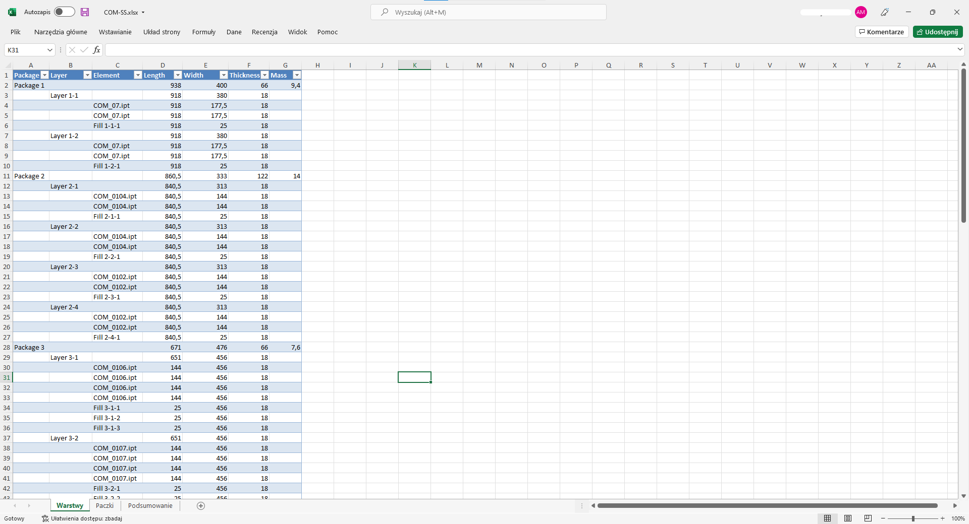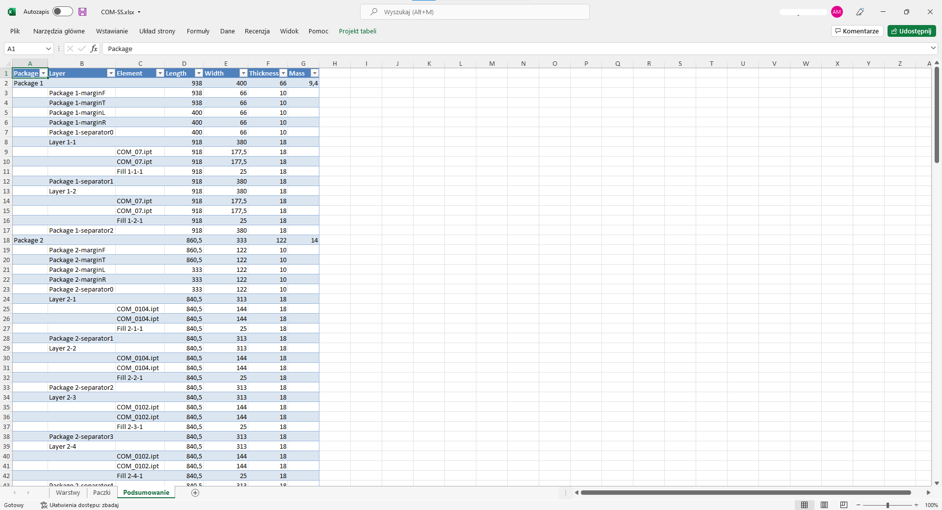 - automatycznie utworzyć raport w formie pliku .xlsx z rozpiską paczek i warstw w trzech stylach